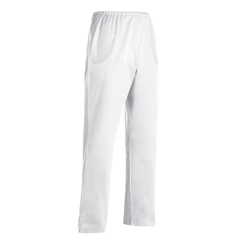 Nadrozmerné kuchárske nohavice z kvalitnej 100 % bavlny, biele pre veľkosti 5XL-7XL.Pružný pás a šnúrka na zaväzovanie, vnútorné vrecká.